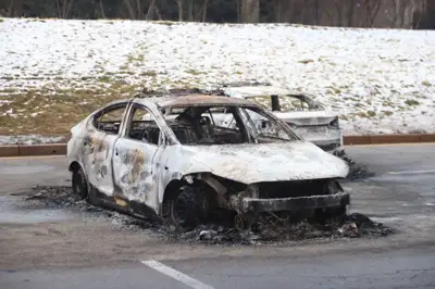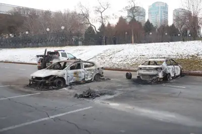 Әкімдік ғимараты маңында өртенген көліктер тұр.
