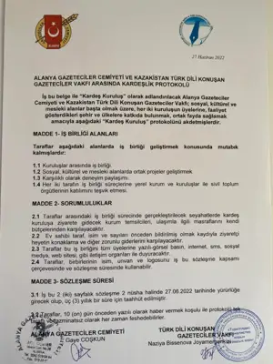 Аталған құжат шеңберінде Қазақстан мен Аланья бұқаралық ақпарат құралдары арасындағы кәсіби бірлікті нығайту, жас журналистердің тәжірибе жинақтауы, Қазақстан мен Аланьяда БАҚ өкілдері үшін пресс турлар, семинар-тренинг, вебинар, конференциялар т.б шаралар ұйымдастыру, медиаға қатысты маңызды жобаларды бірге атқару қамтылды. Аланья Журналистер одағы 1994 жылы құрылған. Ұйымға 2 күнделікті шығатын газет, 4 телеарна, 16 Интернет сайты, “Анадолы агенттігі, TRT, İHA, DHA ақпарат агенттіктерімен бірге жалпы саны 124 мүшесі бар.