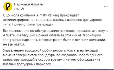«15 шілдеден бастап Almaty Parking тротуар маңындағы ақылы тұрақтарға қызмет көрсетуді тоқтатады. Төлем қабылданбайды.