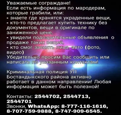 «Егер тонаушылар туралы ақпарат болса немесе ұрланған тауарлар, заттар, қарулардың қайда сақталғанын білетіндеріңіз болса, көмек көрсетулеріңізді сұраймыз. Бұл — әрбір адал азаматтың борышы. Бет-әлпеттерін немесе көлікті түсіріп алған (сурет, видео) адам болуы мүмкін. Криминалдық полиция осы бағытта белсенді жұмыс істеп жатыр. Қандай да бір ақпарат білсеңіздер, бізге қоңырау шалуларыңызды немесе жазуларыңызды сұраймыз», — деді полиция қызметкерлері.
