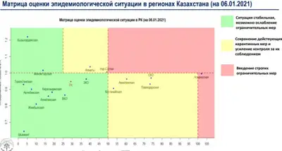 Ведомство мәліметінше, бүгінде «сары» аймақта Алматы, Нұр-Сұлтан, Ақмола, Қостанай, Павлодар және Солтүстік Қазақстан облыстары бар. Қалған өңірлердің барлығы «жасыл» аймақта.