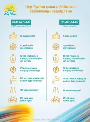 Мемлекет басшысы Қасым-Жомарт Тоқаев жария еткен «Өзгерістер жолы: Әр азаматқа лайықты өмір!» атты Сайлауалды бағдарлама аясында жыл басынан бері Нұр-Сұлтан қаласында 20 мыңнан астам тұрақты жұмыс орны ашылып, 7 дәрігерлік амбулатория пайдалануға берілді, 96 көше жөндеуден өтті және т.б. Бұл жұмыстардың басым бөлігі қала шетінде жүргізілді.