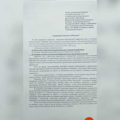 — Оған басты себеп қол жетімді қоғамдық көліктің болмауы. Алматы облысының әкімі Амандық Баталов мырзаның атқарып жатқан оң іс шараларын ескере отырып, Алматыдан Жетіген ауылына дейін үздіксіз жүріп тұрған 220 жолаушылар автобусының бағытын Жетіген ауылының қасында 7-8 шақырым жерде орналасқан Нұра, Туғанбай ауылдарына дейін созуға және осы ауылдарға көгілдір отын-газ тарту мәселесінде шешер деген үмітпен хат жолдап отырмыз. Жұмыссыз жүрген ауыл адамдарының жағдайы күннен күнге ауырлап барады. Соның салдарынан мал ұрлығы да күрт өсіп келеді. Мына хатты Нұра, Туғанбай ауылының 102 тұрғыны қол қойып Алматы облысының әкіміне жолдап отырмыз,-дейді Оразбай Ахметов.
