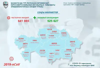 Вакцинаға келсек, 2021 жылғы 8 тамызда Қазақстанда коронавирус инфекциясына қарсы вакцинаның 1-компонентін 5 750 698 адам, 2-компонентін 4 382 869 адам салдырды.