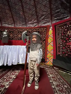 Түс кезінде тамақтану үшін бізді 5-қазақүйге жіберді. Ол жерде біз тіркелмеппіз, сондықтан кіргізбеді. Әйтеуір, әупірімдеп жүріп 7-үйден қолөнершілер (бізден бөлек те көптеген шебер келген) болып кіріп тамақ іштік. Түстен кейін адамдарға лекция оқыдық, теміршілік туралы мәлімет бердік. Ертеде қазақтар қалай кіиінгенін, киімдердің атауы қандай болғанын түсіндірдік.
