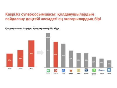 Қазірдің өзінде Kaspi.kz суперқосымшасын 11 миллионнан астам адам пайдаланады. Олардың 6,5 миллионы күн сайын қосымшаға кіреді. Яғни, он адамның алтауы күн сайын Kaspi.kz мобильді қызметтерін пайдаланады. Қолдану деңгейі 60% құрайды және бұл әлемдегі ең жоғары көрсеткіштердің бірі.