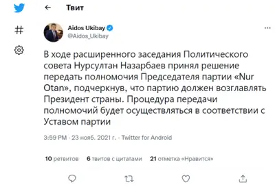 Еске салайық, Нұрсұлтан Назарбаев президенттіктен кеткеннен кейін «Nur Otan» партиясының төрағасы лауазымында қалған еді.