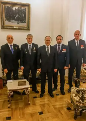 Вагнерліктердің Путинмен бірге түскен әйгілі суреті. Солдан оңға қарай: Богатов, Трошев, Путин, Кузнецов және Уткин. Фото: top-50.ru