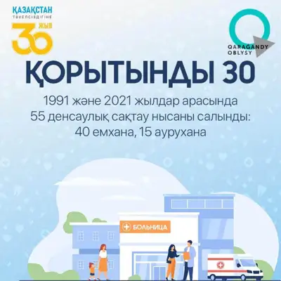 Қарағанды облысында тәуелсіздік жылдары 40 емхана мен 15 аурухана салынды. Он жыл бұрын жаңартылған қан орталығы іске қосылды. Ауылда медицинаны дамытуға «100 мектеп, 100 аурухана» бағдарламасы көмектесті.