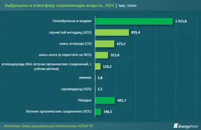 2021 жылы атмосфераға шыққан газ тәрізді және сұйық ластаушы заттардың үлесі 79,6 пайыз немесе 1,9 миллион тонна болды. Оның ішінде күкірт диоксиді — 835,4 мың тонна, көміртегі тотығы — 473,2 мың тонна, азот оксиді — 322 мың тонна, көмірсутек — 133,2 мың тонна.