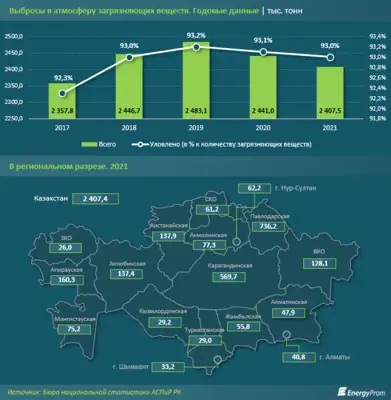 2021 жылы Қазақстандағы барлық стационарлық ластаушы көздерден шығатын зиян заттардың жалпы көлемі 34,3 миллион тонна болған, бұл 2020 жылмен салыстырғанда 3,3 пайызға аз. 31,9 миллион тонна зиян шығарынды залалсыздандырылған. 2021 жылы атмосфераға шыққан ластаушы заттар көлемі 2,4 миллион тонна болған, бұл 2020 жылмен салыстырғанда 1,4 пайызға аз.