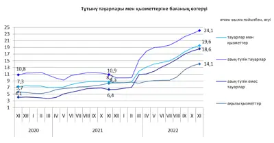 Инфляция 2022 жылғы қарашада жылдық есептеуде 19,6% құрады. Азық-түлік тауарларының бағасы 24,1%, азық-түлікке жатпайтын тауарлардікі 18,6%, ақылы қызметтердікі 14,1% өсті.
