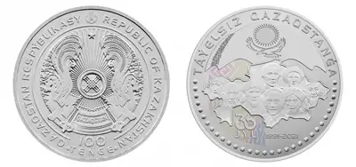 TÁÝELSIZ QAZAQSTANǴA 30 JYL коллекциялық номиналдары 5 000 және 500 теңгелік күмістен және номиналы 100 теңгелік мельхиордан жасалған монеталар.