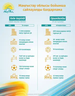 Өңірде 9 ай ішінде 2025 жылға дейін жоспарланған 872 іс-шараның 27%-ті орындалған. 809 мың шаршы метр тұрғын үй бой көтерген, 28 мектеп салынып, жөндеуден өткен, 22 мың тұрақты жаңа жұмыс орны ашылды.