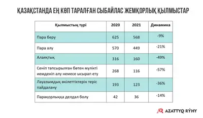 Айта кетерлігі, сыбайлас жемқорлық қылмыс құрылымында парақорлықтың үлесі жылдан жылға өсуде. Оның ішінде пара алу және беру, парақорлыққа делдал болу сынды жағдайлар жиі тіркелген. 2015 жылы бұл әрбір үшінші қылмыс болса, 2021 жылы 67%-дан астам қылмыс осы санатқа жатады.